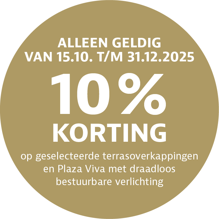 - 10 % korting op uw glazen terrasdak Terrazza Pure, Terrazza Sempra of Terrazza Originale of uw pergolazonwering Plaza Viva inclusief lichtlijst, handzender en ontvanger